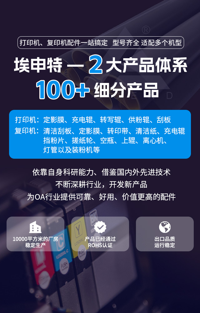 成立于2005年,下屬工廠從2000年始一直致力于打印機、復印機配件的研發(fā)、設計、制造及銷售。